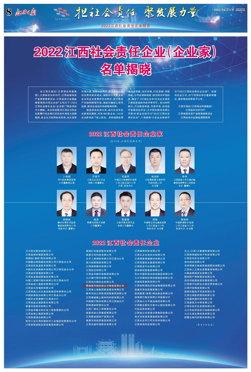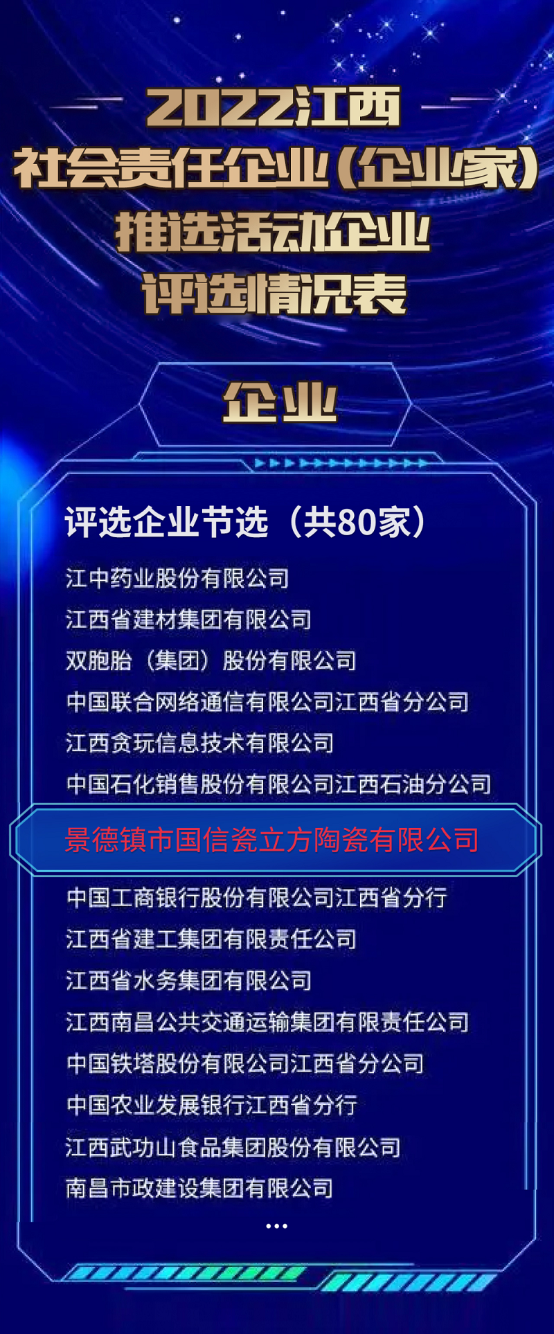 6月2日,由江西日報社(江西報業(yè)傳媒集團(tuán))、省農(nóng)業(yè)農(nóng)村廳、省國有資產(chǎn)監(jiān)督管理委員會、省地方金融監(jiān)督管理局共同主辦的“義利天下·2022江西社會責(zé)任企業(yè)(企業(yè)家)”推選活動正式揭曉,景德鎮(zhèn)市國控集團(tuán)旗下國信瓷立方陶瓷有限公司從全省480家企業(yè)中脫穎而出,成為景德鎮(zhèn)市唯一入選企業(yè)。